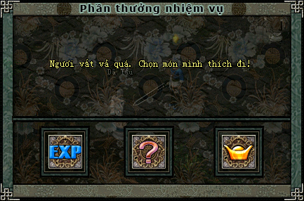 Tùy theo độ khó của nhiệm vụ, Dã Tẩu sẽ tặng bạn những phần thưởng có giá trị tương ứng. Và được chia thành 3 nhóm phần thưởng để bạn chọn. Tùy vào nhu cầu của bạn và tùy vào các phần thưởng mà Dã Tẩu tặng, bạn hãy chọn phần thưởng nào mà bạn thích nhất.